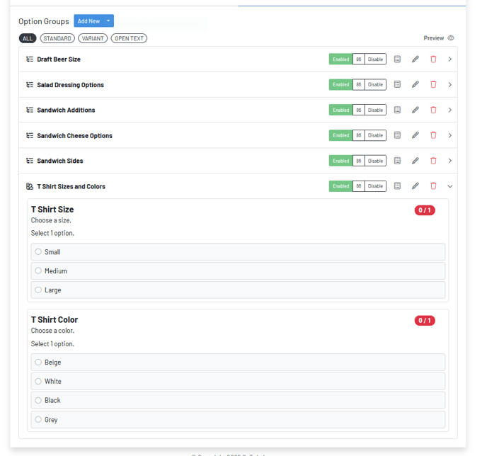 To add any new Option Groups once turned on for your location, navigate to your Product Catalog and toggle over to Options--Add New Option Group.