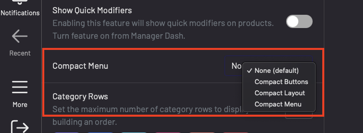 In an effort to provide more options for how products and menus are displayed on the POS, GoTab has expanded its Compact Menu options on each POS display. The settings selected will only impact the specific display and will apply to every menu shown on that display.