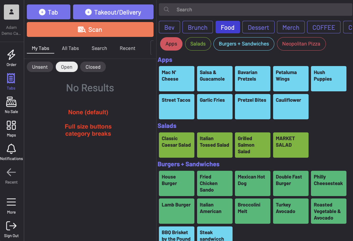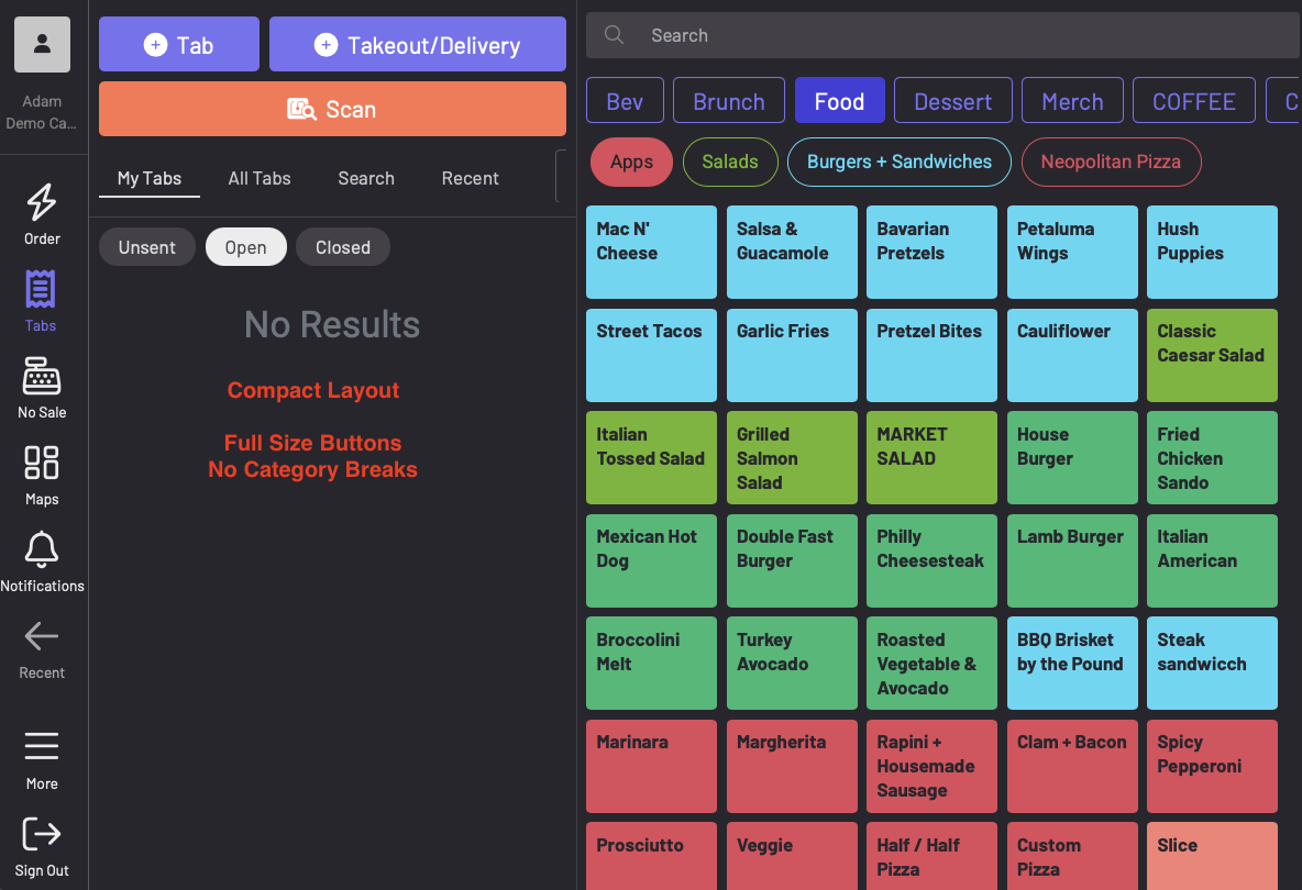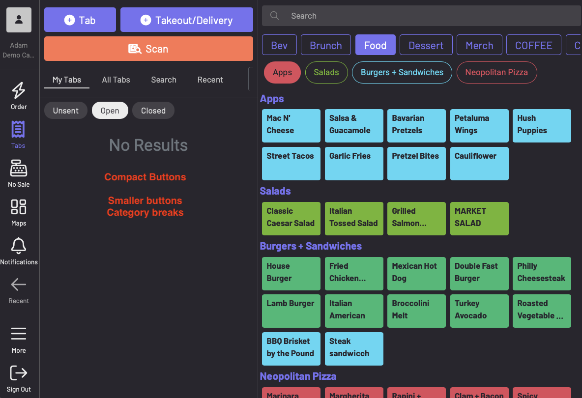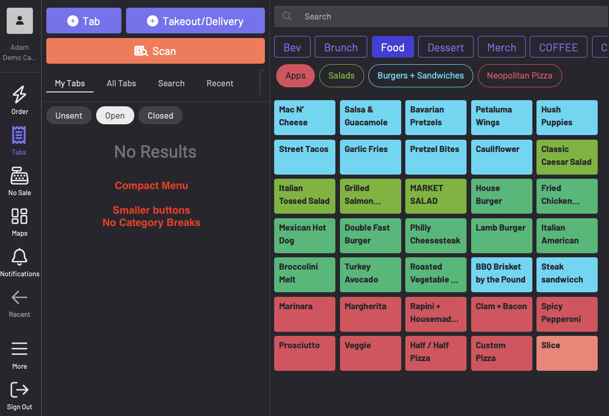 Pro Tip: If using Compact Layout or Compact Menu options, color-code your products to make it easier to see and find items quickly. Colors are set on the category and product levels in the Product Catalog of your GoTab Manager Dashboard.