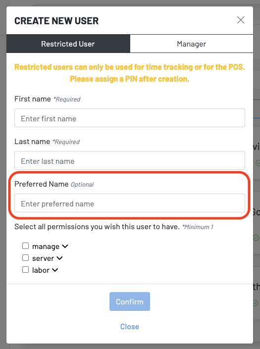 A new field has been added to your user's profile called Preferred Name. The name filled in this field will show on the POS to show who is assigned to spots and tabs, customer receipts, kitchen chits, user reports, and Manager Dashboard Service Reports. Note: It is an optional field for each User, and if left blank, the First Name and Last Name will continue to populate in those areas as expected.